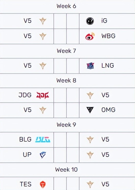 看了下V5后半段的赛程,基本上没什么太厉害的强队,如果非要说的话,WBG和LNG勉强能算吧,但这两支队伍最近的状态实在是有点不稳,后续第八周JDG和OMG或许能与之一战,最后就是第10周收官战对阵TES。