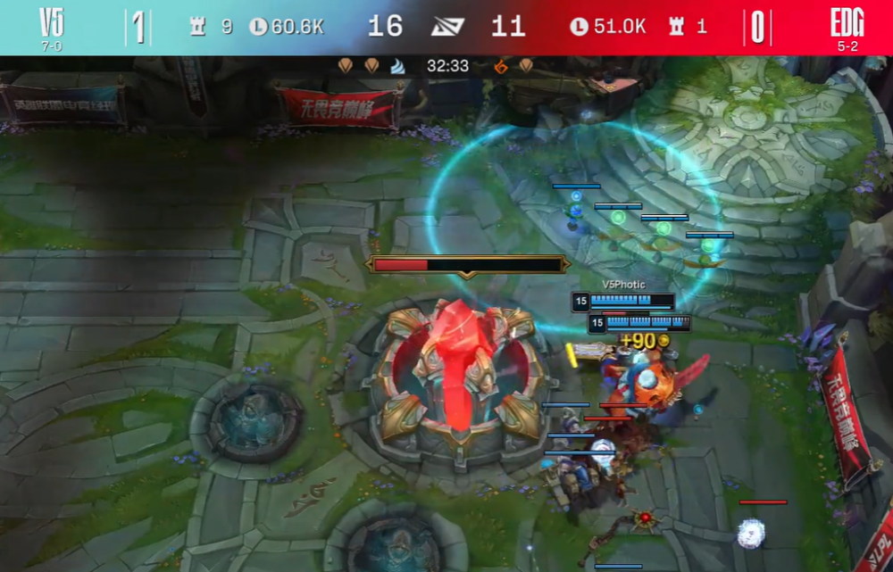 手握大龙Buff,V5轻松推上敌方高地,手感火热的Photic赛娜连斩五人,带队团灭EDG,一波终结比赛,至此V5击败EDG豪取8连胜,另一边不敌V5的EDG吞下连败苦果。