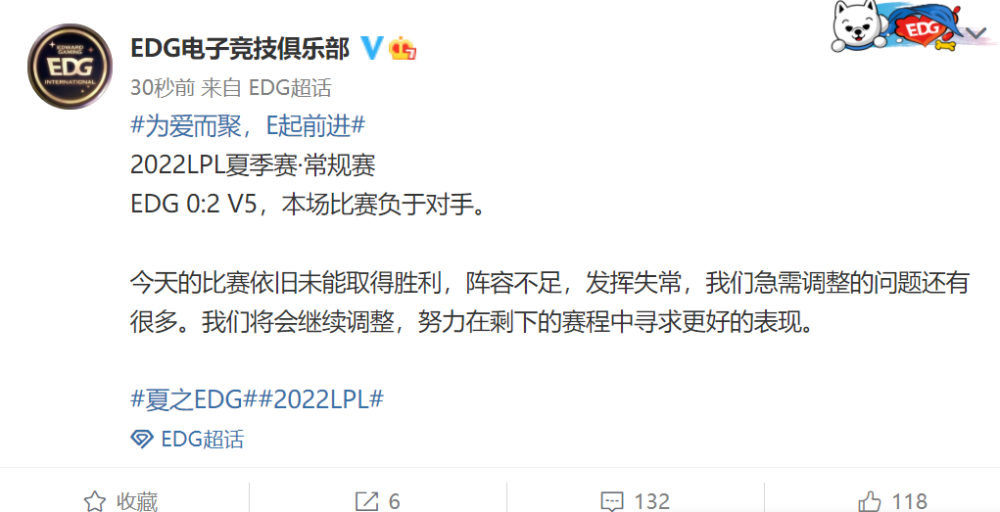赛后EDG官博发文,用六句话安慰观众:EDG依旧没能取胜,阵容不足,且选手发挥失常,EDG需要解决的问题有许多,接下来会继续调整,尽量打得更好。
