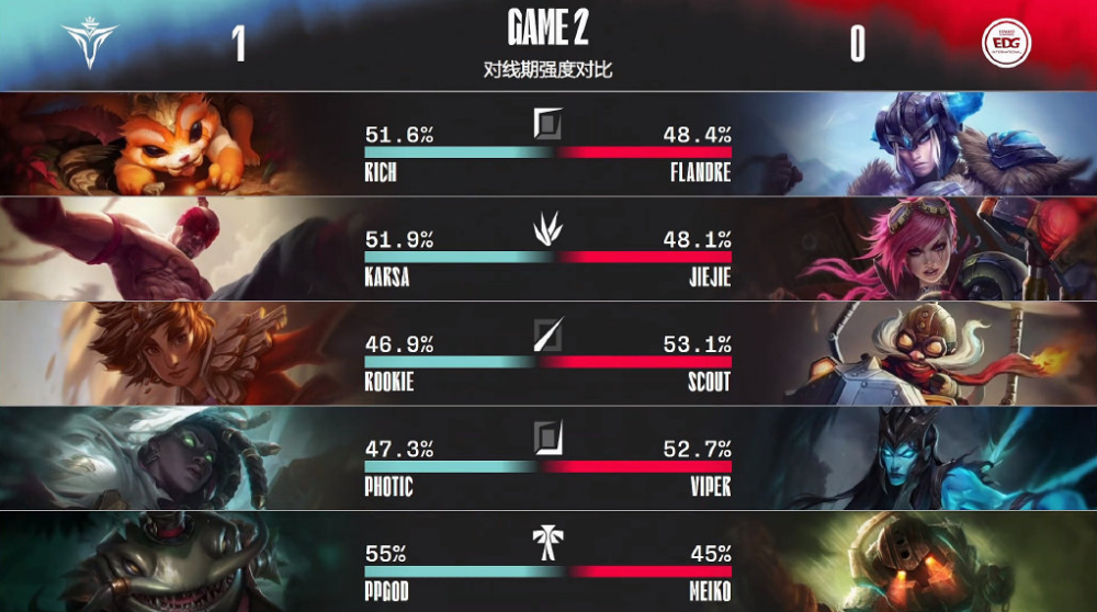 单从阵容来看,V5拥有主动权,上野战斗力远超对位英雄,且Rookie岩雀能够依靠大招切割EDG阵型,同时下路组合抗压能力出众,V5中野能够全力进攻上路,配合Rich纳尔取得优势,依靠峡谷先锋进入推塔拿龙节奏;和V5不同,EDG战术重心在下路,Viper卡莉斯塔手握线权,可以协助Jiejie争夺小龙,在下半区撕开V5防线,Photic和Ppgod能否顶住压力是关键。