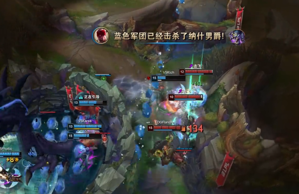 再往后两队针对小龙爆发团战,V5众将上演“极限拉扯”,击杀四位EDG队员后,收下队内第三条小龙,随后抱团Rush大龙,EDG众将及时赶来阻止。关键时刻Rich纳尔一击制胜,在Jiejie蔚大招锁定自己的瞬间,Rich纳尔果断跳出龙坑,有效牵制EDG多位队员,助V5收下大龙的同时,赢下团战,此时胜利的天平朝着V5倾斜而去。