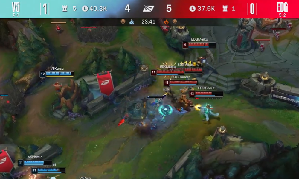 在自己的首个赛点局,V5继续提速,卡萨Karsa选出盲僧配合义进哥Rookie岩雀,EDG小学弟Scout和Jiejie用飞机+蔚应对,走上路的Rich纳尔对抗圣枪哥Flandre猪妹,下路同样“火药味”十足,风头正盛的Photic使用赛娜搭配Ppgod塔姆,等待他们的是Viper卡莉斯塔、Meiko泰坦。