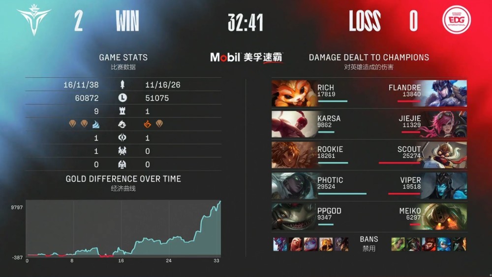 第二局比赛,V5蓝色方,禁用卡牌、沙皇、波比、吸血鬼、巨魔,选用Rich纳尔、Karsa盲僧、Rookie岩雀、Photic赛娜、ppgod塔姆;EDG红色方,禁用泽丽、烈娜塔、猴子、格温、船长,选用Flandre猪妹、Jiejie蔚、Socut飞机、Viper卡莉丝塔、Meiko泰坦