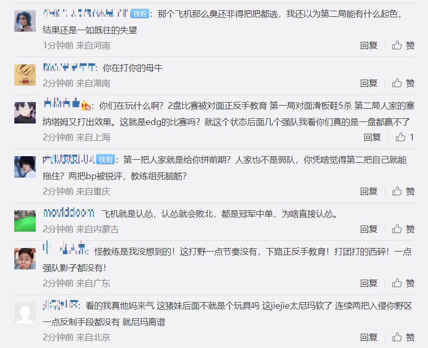EDG官博下方的评论如下,首先是很多人怒喷EDG的教练组,认为BP太差了,两把比赛的BP都不如V5,自从朱开走了之后,EDG的BP一直都不是很好。也有人怒喷Scout的飞机,玩得这么臭还要连选2场,第一局已经没打好了,第二局还是一如既往让人失望,玩飞机一旦怂了就输了,都是冠军中单,为什么scout打得这么怂。还有人表示这场比赛怪教练是没道理的,就是选手打得差,打野没有节奏,下路被正反手教育,团战不如对面,EDG看起来根本不像是一支强队。