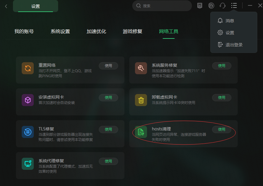出现战网国际服登录不上、登不上去的情况,可能是网络故障导致的。建议玩家使用奇游hosts清理功能来修复网络,点击右上角设置,选择网络工具,点击使用hosts清理功能。玩家等网络修复后,再重新登录战网国际服即可。