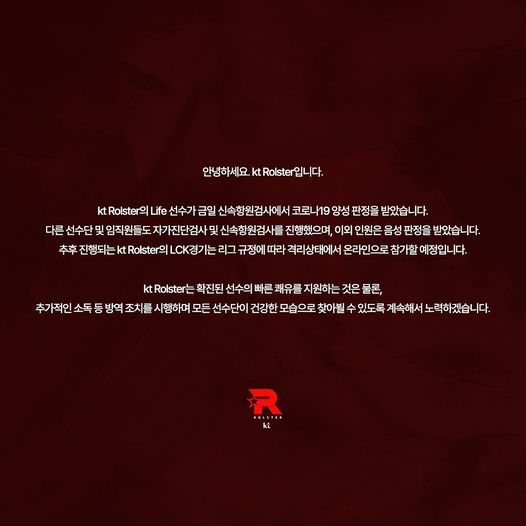 KT发布公告,表示继打野Cuzz后,辅助Life也感染了新冠,之后的比赛他将以线上方式参加。