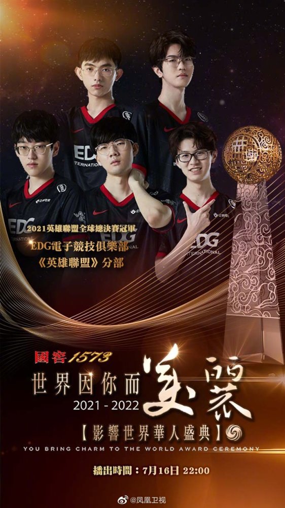 EDG获得了由凤凰卫视评选的“影响世界华人大奖”,颁奖典礼将在7月16日晚上举办。