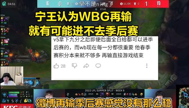 在NING的直播当中也是回应了为何希望THESHY获胜的原因,NING认为如今的V5战队已经确保晋级季后赛了,所以就算跟WBG战队的比赛输掉,那么V5还是有机会晋级季后赛而且还有可能拿到前2,但是WBG战队不同如果WBG输给了V5,那么WBG战队很有可能无缘季后赛,自己作为曾经他们的队友,肯定希望他们都能进入季后赛。