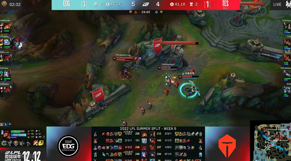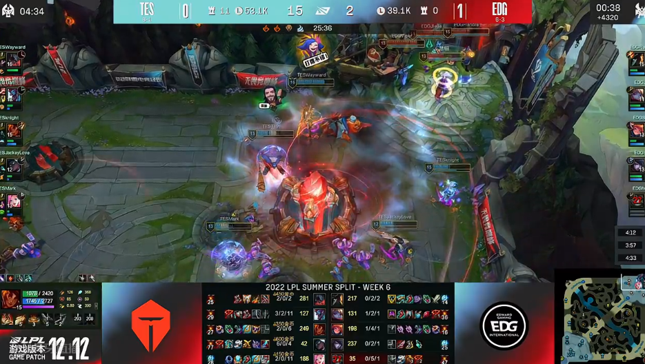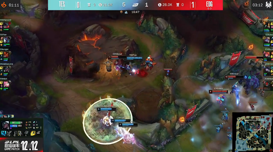 在第三局比赛中,前期TES有点小劣势,直到24分钟左右,TES中路推一塔,被EDG包围,TES反打零换二,找回点节奏,开始逆转局势。