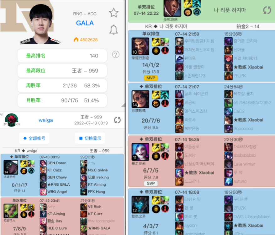 RNG选手GALA韩服大号的对战记录定格在7月13日凌晨一场0-11-17的赛娜,距今已经过去三天都没有训练,不符合职业选手的备战情况,反倒是RNG助教小白的航服账号突然开始狂玩ADC,因此很有可能是GALA自己的号被封了,所以玩小白的。