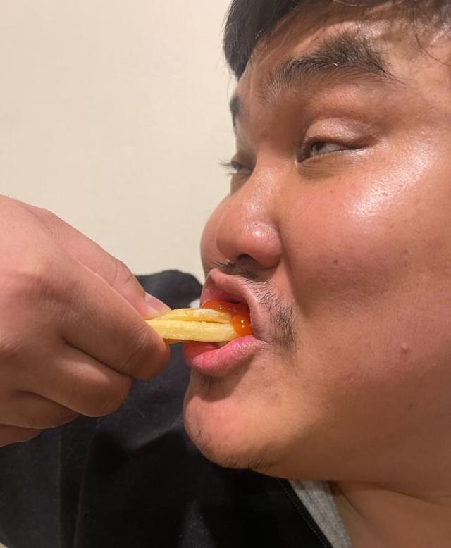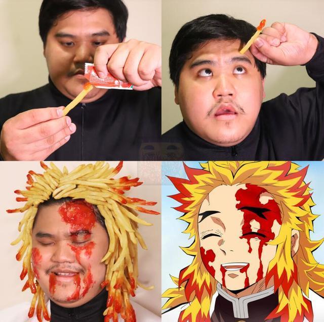 泰国小哥叫了一个超级无敌薯条套餐,沾了番茄酱之后,一根根的贴在自己的头上, 泰国小哥还将番茄酱搞到自己的脸上,还原了炼狱杏寿郎大战猗窝座后,虽然重伤,可是依然保持微笑的样子。