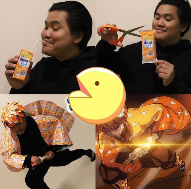 为了cos善逸,泰国小哥这一次下了血本了,买了好几箱的饮料,都喝完之后,泰国小哥将这些饮料盒子一个个剪开,这cos就完成啦!