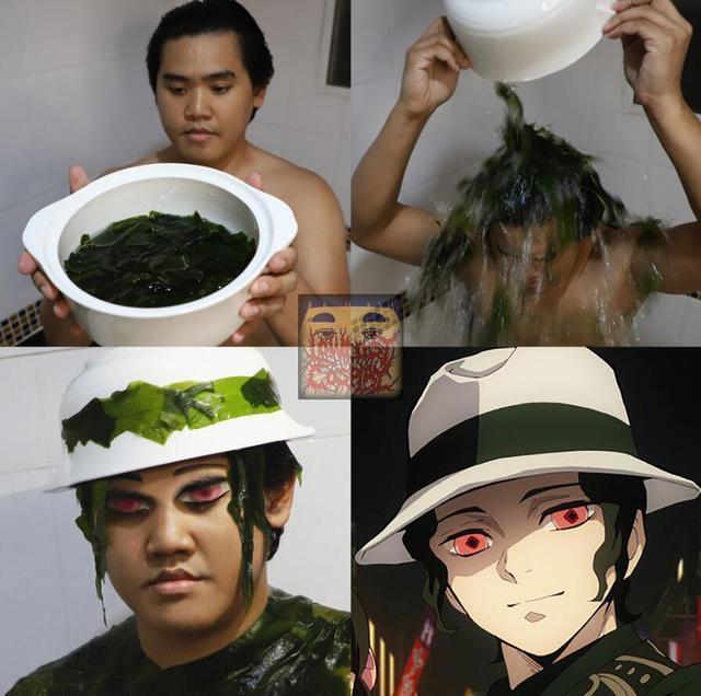 泰国小哥直接拿来一个锅,里面装满了海藻,泰国小哥将它们倒在自己的头上,然后就完成了cos,真是有没有这么丝滑的?