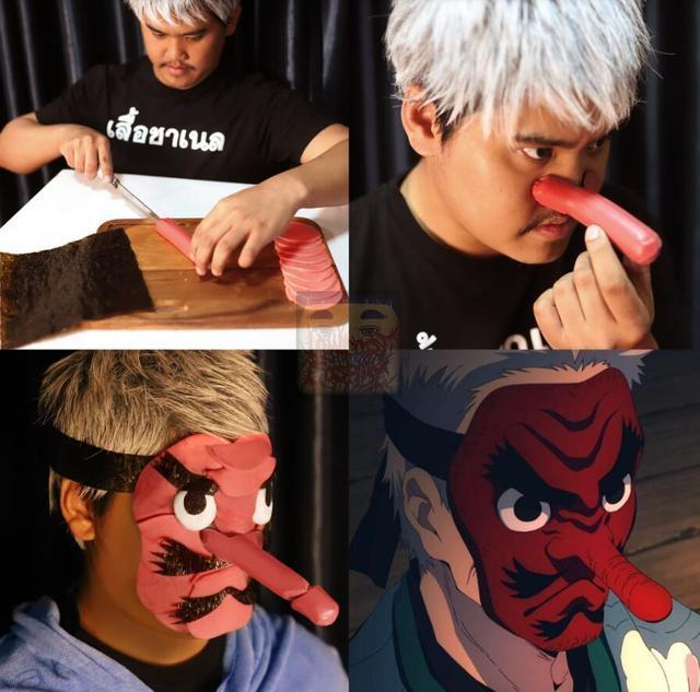 泰国小哥用火腿雕刻出了鳞泷左近次的面具,真的是活灵活现。