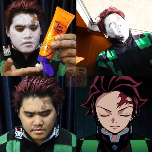 泰国小哥先是在自己的脸上涂上防晒霜,然后就去晒太阳,晒了几个小时之后,终于是将炭治郎头上的标记给晒出来了!