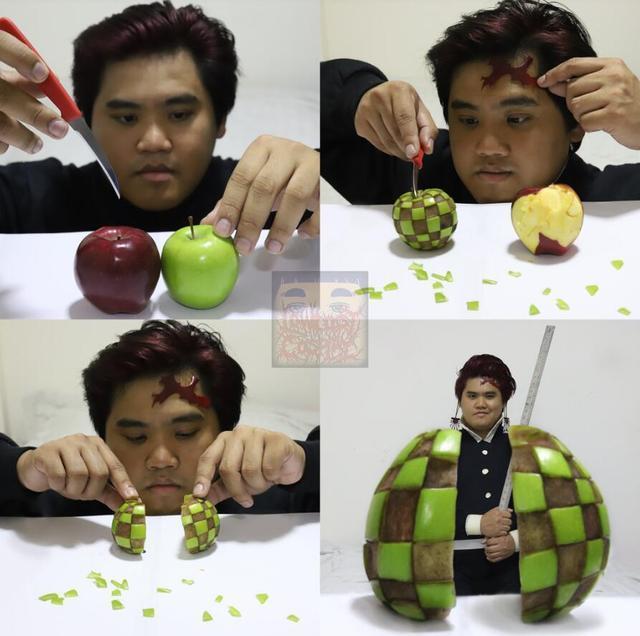红苹果的,泰国小哥将皮学出来充当炭四郎的额纹,而青苹果,泰国小哥则是用来雕刻出炭治郎的衣服。