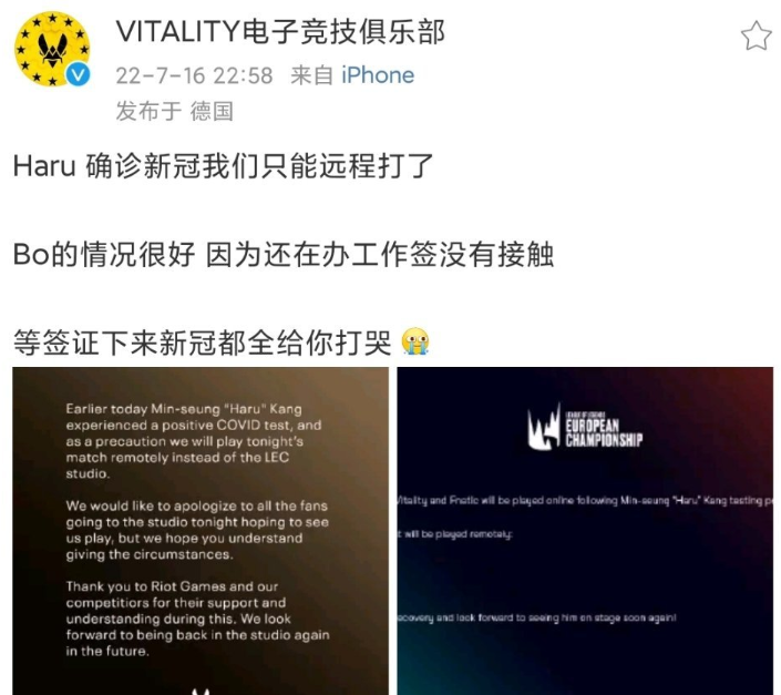 VIT电子竞技据俱乐部发微博宣布:Haru确诊新冠,我们只能远程的比赛了。BO的情况很好,因为还在办工作签没有接触,等签证下来新冠全给你打哭。