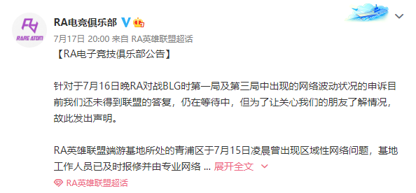 7月17日,RA官方发布声明,告知观众们:已核实为该区域内区域性断网进行网络维护,俱乐部向联盟再次进行比赛结果申诉。RA始终相信电子竞技比赛公平公正公开的原则,事情发生到现在,我们也一直积极进行沟通,并仍然保着信任得到态度等待一个答复。