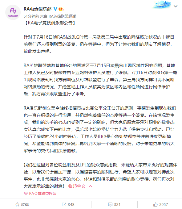 不过就在近日,或许是这一场比赛对选手们的心态造成了比较严重的影响。RA官方则发布了一个公告,从公告中可以得知,当时俱乐部基地的网络问题并不是俱乐部自己造成的问题,而是所在地区的局域性网络都出现了问题。在这样的情况下,RA采用了向联盟申诉的办法。同时,RA官方还表示,这件事情导致选手们的心态受到了一定的影响,但选手们仍愿意秉承对职业的敬业态度认真完成接下来的比赛,而俱乐部也始终坚持为选手提供支持和帮助。所以,RA官方也希望自己的申诉能够早日得到具体的答复。最后,RA官方还呼吁大家理智对待这件事情。