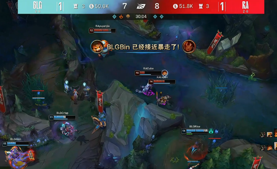 或许是掉线的原因而导致自己陷入了劣势,在接下来的比赛中,RA选手们的心态似乎发生了一些变化。一直迫切想要与BLG打团,更是忽略了不少野区资源的争夺。最终,心态方面的受挫也是让BLG抓到了机会,而BLG更是轻松拿下了电龙龙魂,同时也顺利拿下了这一场比赛的胜利。