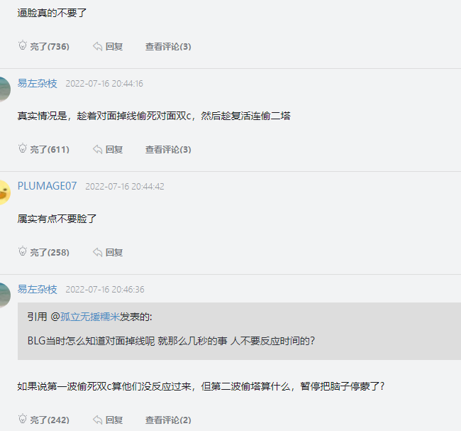 实际上,他们不是“及时”赶到,只是RA掉线而已。BLG的说法让很多人感到无语,有人指出:“实际情况是BLG趁着对面掉线,击败双c,然后趁恢复的机会偷走二塔”。