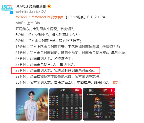 大家为BLG、RA和LPL的处理结果争论纷纷,那么战队是怎么想的?赢比赛之后,BLG战队发了一条动态,可以看到他们对网络波动的描述:对面拿到大龙,我方及时赶到并击溃对面双c,获得胜利。