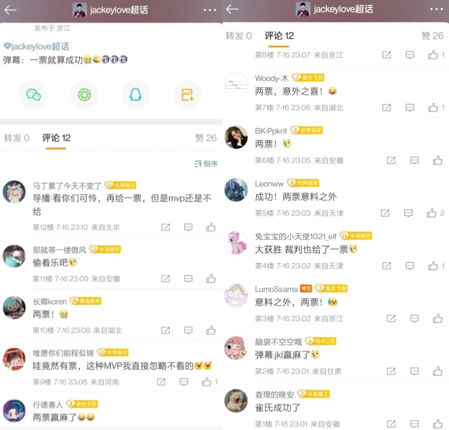 就算不拿mvp也可以,解说至少要给JackeyLove投票。之前选择mvp的时候,中单、辅助都有票,JackeyLove却无人问津,导致粉丝爆破。这一次TES赢了EDG战队,JackeyLove粉丝为两票mvp庆祝。