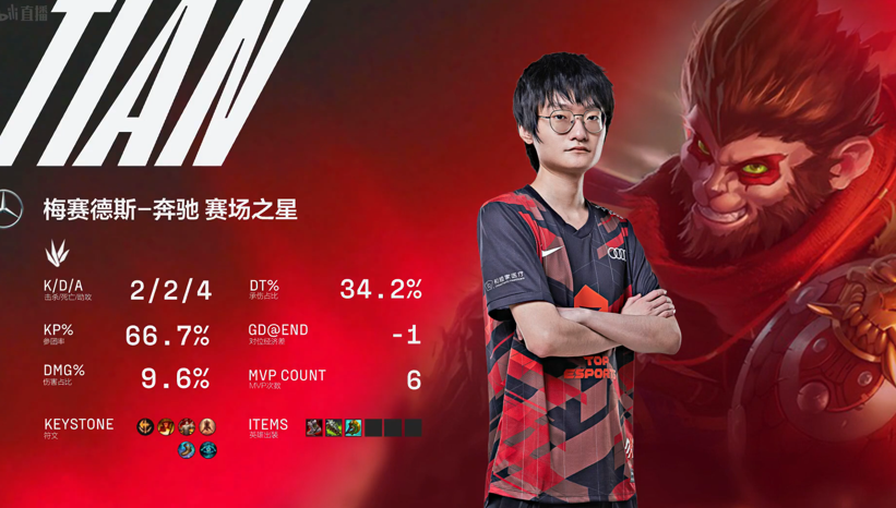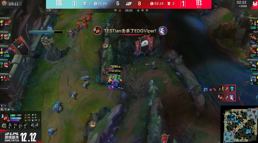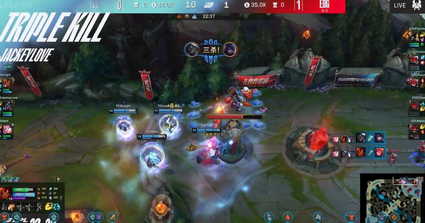 第3局,前期TES这边是有点劣势的,人头也是EDG领先,不过后来TES找到一个机会反打一波拿到2个人头扳回节奏,比赛的关键点是在EDG开大龙的时候,又是小天神勇发挥抢到大龙,TES趁机强攻连续击杀了对手4人,并带着中路兵线一波拿下比赛,让1追2成功!