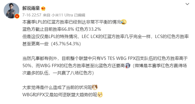解说雨童吐槽LPL红蓝双方胜率差距太大?其他赛区竟没有这种情况!