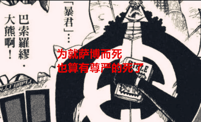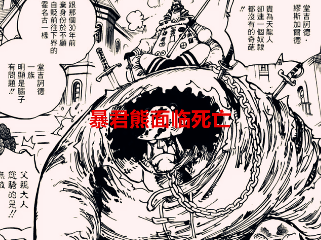 这一话漫画中,可以确定的是,有角色死亡了,并且是跟萨博有关联的,那么这里就很容易让人联想到暴君熊了,因为暴君熊目前已经被博士利用完了,而且天龙人还把暴君熊当坐骑,说白了,暴君熊的存在已经没有任何的价值了,所以世界会议篇中很有可能发生了这样的事情,萨博和三位军长跟天龙人宣战然后救暴君熊跟两位大将打,最终不敌大将,生死之际被恢复一丝神智的暴君熊挡下致命攻击并拍飞了萨博,而暴君熊则死了。
