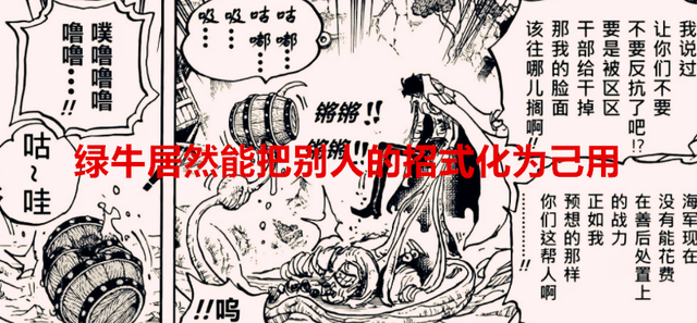 换句话来说就是,绿牛已经掌握了三灾的招式了,他跟黑胡子的暗暗果实还是有区别的,黑胡子的能力仅仅是让别人的招式无效化,对自己没办法产生伤害,但是绿牛的不同,他是可以把别人的招式转化为自己的能力,但这跟模仿果实又不一样,模仿果实只是仿造别人的外表,但招式和力量是没有办法仿造的,所以绿牛才这么有底气,只要被他吸收过的人,他就能发挥别人的招式,这种能力相当变态了。