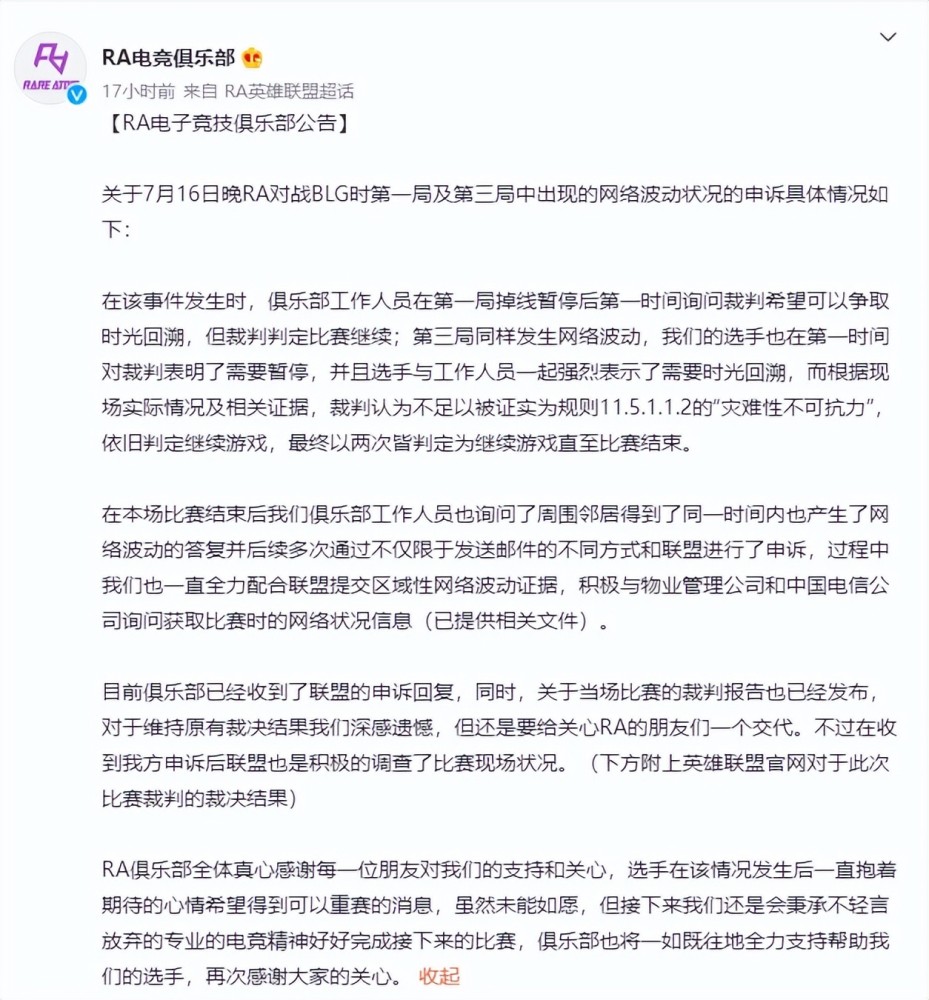 就在这场比赛中RA全员集体掉线,第一局中便有所显示,然后特别是在第三场对局之中,RA原本凭借优势团战拿下大龙,结果却在追击过程中因为掉线从而导致双C被击杀,随后自家的塔也被BLG给推掉,自此优势变劣势,由BLG捧得胜利。这场比赛之后RA立马公开表态向LPL官方对是否进行时空回溯的状况进行申诉,然而最近RA也是在19号的凌晨发布了最新公告,公告内容十分繁杂,简单来说便是官方驳回了这一申诉。