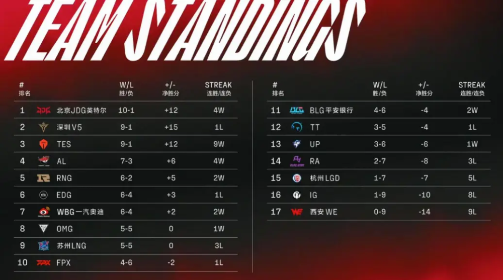 而小编在这里预测一下,最终进入季后赛的名额可能就与现在的积分榜没有太大差别了,唯一可能有点悬念的可能就是FPX与BLG这两支队伍到底是谁看谁的脸色才能进入季后赛。而V5则错失了良机,复活甲的机会也极有可能被TES这支队伍拿到手。