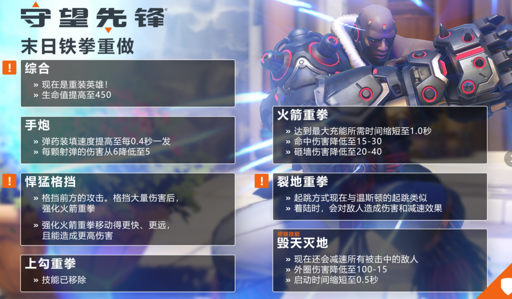 在7月15日《守望先锋》归来BETA测试的最近更新中,我们看到诸多角色的平衡性再次做出了调整,如末日铁拳强化火箭重拳最小阻挡伤害降低、秩序之光传送面板的冷却时间降低等等。