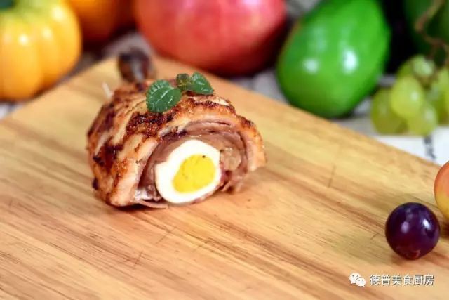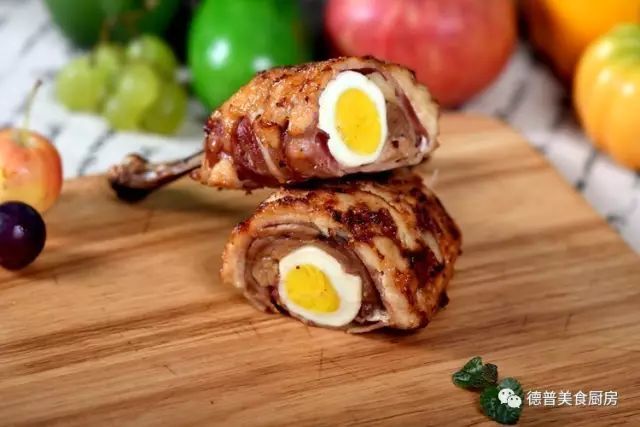 3、将熟鸡蛋放在鸡腿肉中间,用培根肉包裹住,牙签固定;
