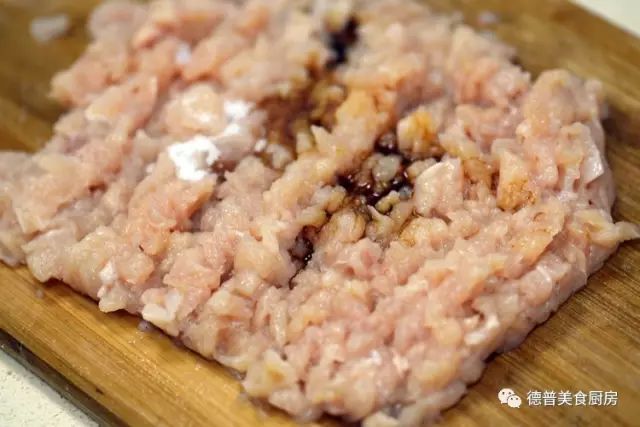2、将鸡肉丁剁成泥,加入盐、酱油混合均匀备用;