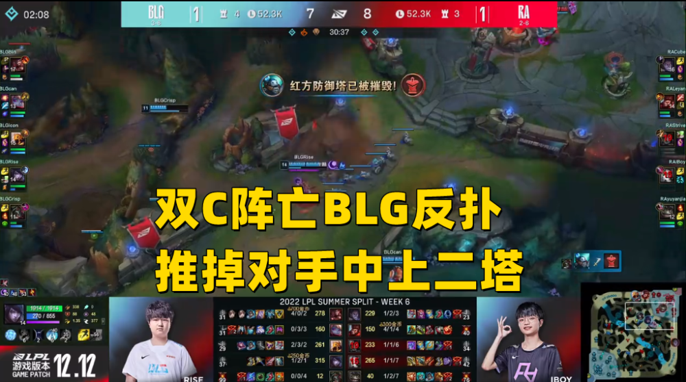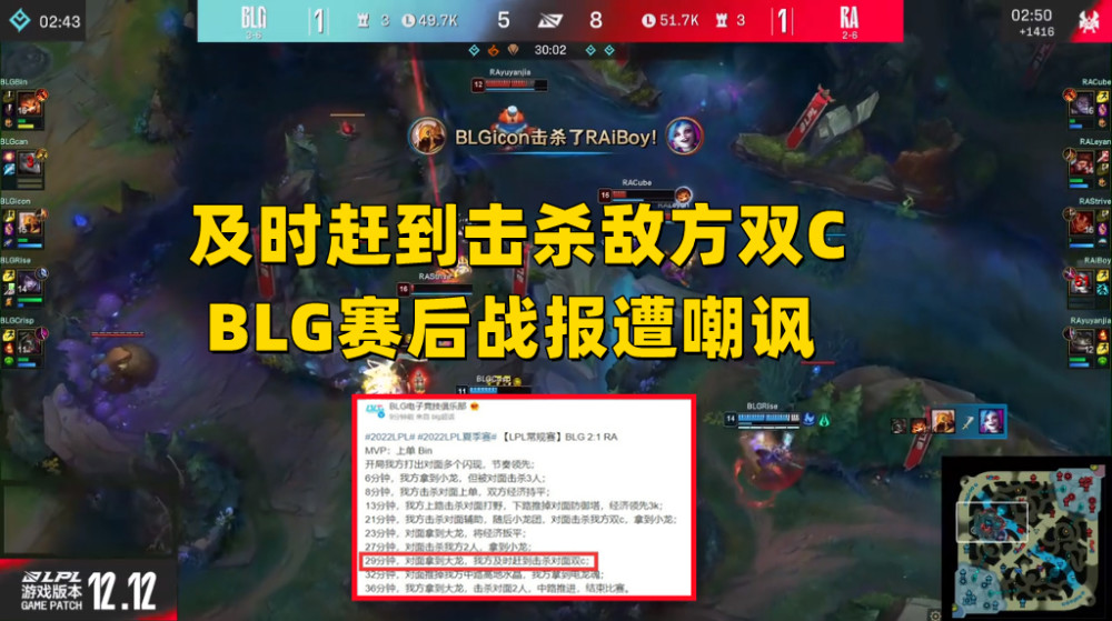 在击杀RA双C,暂停重新回到比赛之后,BLG靠着这一波人数差的优势,反推掉了RA的中上两路二塔,拉回了不少经济,但在大多数观众看来,BLG这一波操作属于乘人之危,因为此前击杀双C时,虽然对方行为比较古怪,但游戏并没有掉线提示,也很难判断对手是不是失误,而推二塔这波操作,的确有吃到掉线的红利。