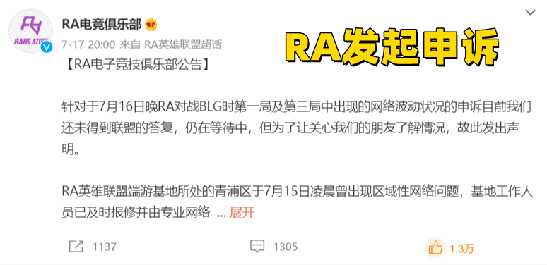 对于BLG和RA双方来说,在这种争夺季后赛名额的节骨眼上,谁都希望多拿下一个大场积分,但因为网络问题输掉比赛,RA自然是不太满意的,因此对于官方裁定继续比赛的结论,RA提出了质疑,在1月17日向LPL官方进行了申诉,而申诉的理由也简单且合理,网络波动并非只是RA基地,而是区域性的网络波动。