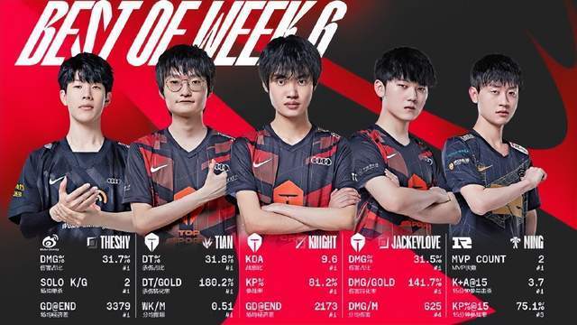 在第六周因为队伍仍旧延续着连胜的出色表现,因此TES足足有三名选手入选了第六周最佳阵容,分别是打野位的小天、中单位的Knight以及下路AD选手Jackeylove。毕竟TES现在是LPL常规赛成绩最好的队伍之一,九连胜的豪华战绩足以看出选手们有着多么出色的发挥,而在第六周TES更是接连击败OMG、EDG两支目前联赛积分榜上游的强队,因此能够有三人上榜也是理所当然。