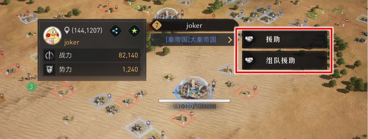 盟友可选择对方建筑,进行援助或组队援助。
