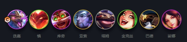 迭嘉、慎、飞机、亚索、塔姆、金克丝、巴德、琴女