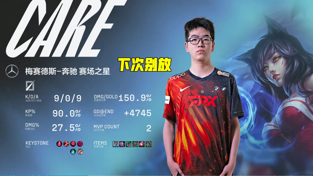 中期AL想靠团战扳回劣势,Lwx的轮子妈作用就体现出来了,开启大招后能不断拉扯,Care七进七出秀翻全场,23分钟轻松超神,FPX推平基地拿到胜利!MVP毋庸置疑给到狐狸绝活哥Care,9-0-9的完美战绩,多次进场输出却一次没死,并打出全场最高伤害!