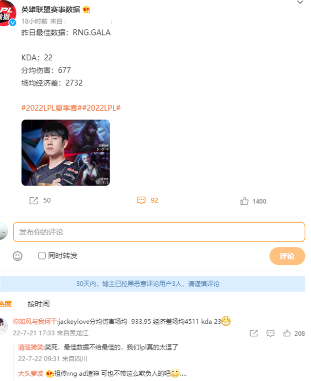 看到这个动态,许多人质疑LPL又“剥夺”了JackeyLove的荣誉,真就“有冰去冰”?这一天的赛场最佳数据给的是gala,他的kda是22,剩下两项也比较高。可是,JackeyLove这三项似乎都比gala高。