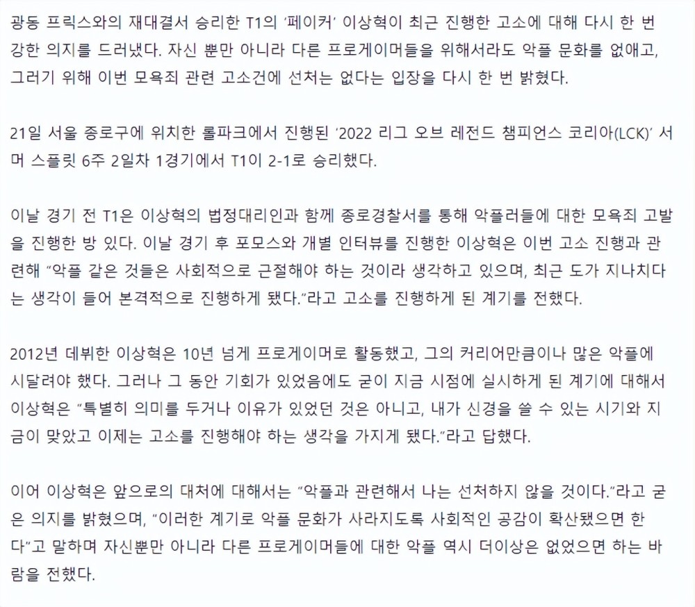 采访内容中,Faker也表示:这次起诉发表恶评的人,不仅仅是为了自己,也是为了其他职业选手,自己不会放过这些恶评者,而且自己认为应该从社会层面上消除恶评这种行为,因为最近恶评太猖獗了,所以自己决定起诉,希望利用这个机会可以消除恶评文化。
