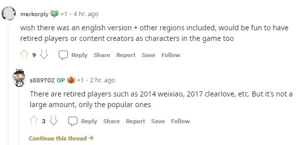 -希望有一个英文版本+其他地区的版本,如果有退役的职业选手或内容创作者(游戏内主播)作为游戏中的角色,也会很有趣。