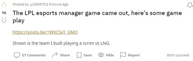 该热帖标题:LPL电竞经理的游戏出来了,这里有一些游戏玩法(并附上该做宣传片链接)