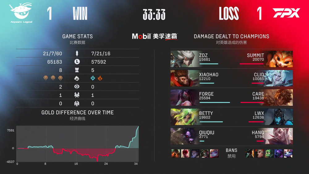 双方第二局的比赛,先赢一局的FPX,可能是太想毕其功于一役,太急了,白白浪费了一场好局。小凤凰在比赛期的前25分钟里面,一度掌控高达近5K的经济优势。可惜的是,太急也太浪了。在30分钟左右,AL等来了转折点,FPX洛先手开团,但被阿卡丽从侧面切割战场,AL盯着经济差打出了一波1换4团战,转手拿下大龙;33分33秒,经济反超的AL率先开团,随后完成一波0换5完美团战后,扳平比赛,双方进入决胜局的比赛!