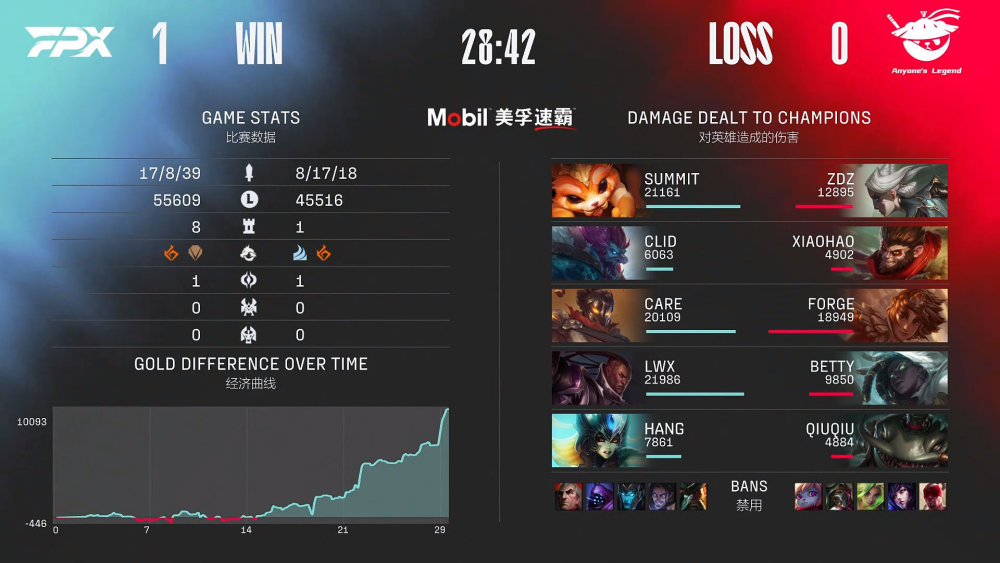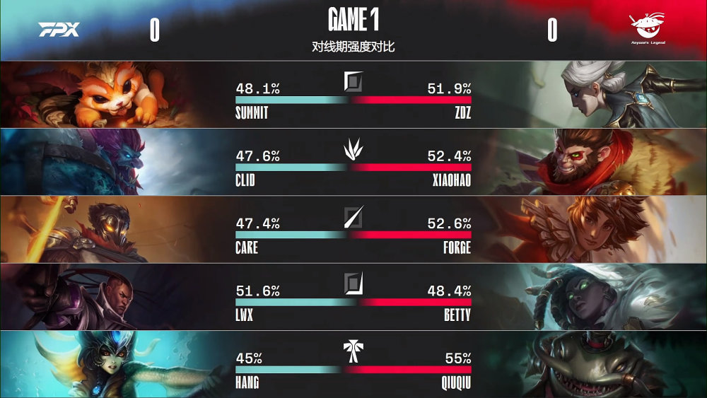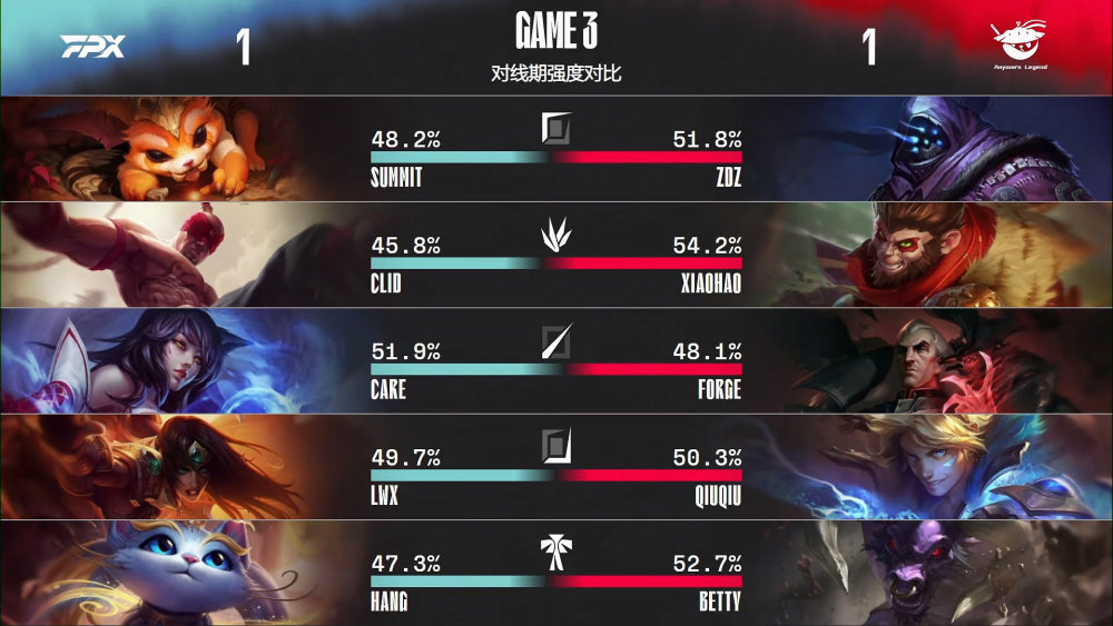 决胜局,FPX蓝色方,禁用船长,滑板鞋,塞拉斯,赛娜,泰坦,选用Summit纳尔、Clid盲僧、Care阿狸、Lwx战争女神、Hang猫咪;AL红色方,禁用烈娜塔,卢锡安,泽丽,厄斐琉斯,洛,选用Zdz武器大师、Xiaohao猴子、Forge乌鸦、Betty伊泽瑞尔、QiuQiu牛头