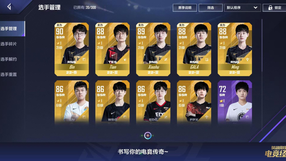 当然,这款游戏也不是一无是处,选手的卡牌获取难度还是挺低的,福利也还可以。我充了六块钱就组成了BIN+TIAN+XIAOHU+GALA+MING的全华班阵容,适合喜欢收集选手的玩家们。