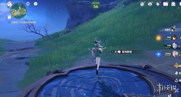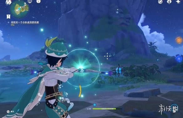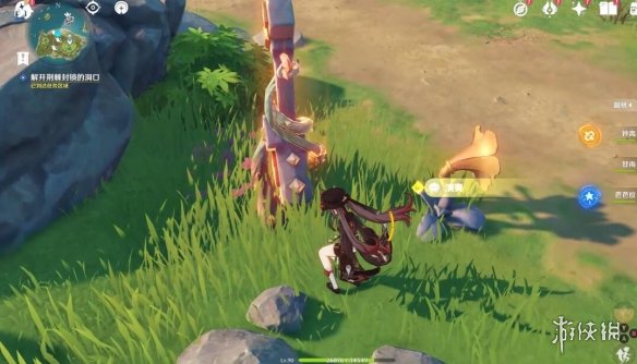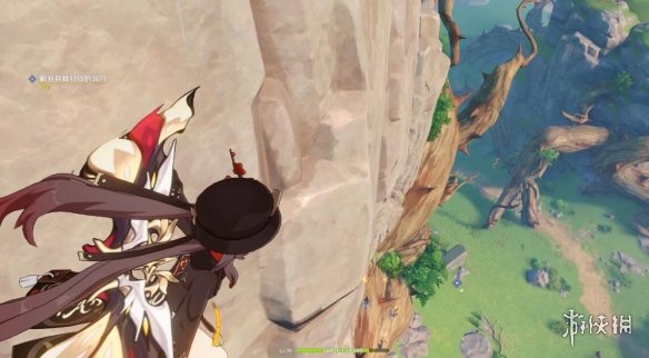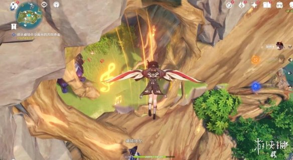 切换完,任务下方就显示剩余多少米了,前方有个风元素方碑,点亮它,跟随产生的风场,飞上去。